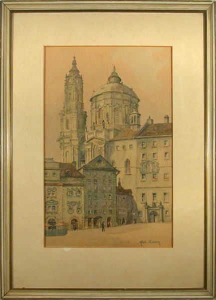 Blick auf die Nikolaikirche in Prag mit umgebenden Häusern und Figurenstaffage