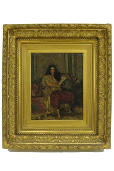 | An Arab harem girl, barefoot and seated on divan with Oriental rug cover. | |