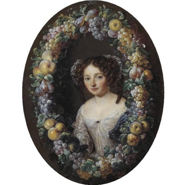 | PORTRAIT OF A LADY, HALF LENGTH, FRAMED BY A WREATH OF GRAPES, APPLES AND PLUMS | |