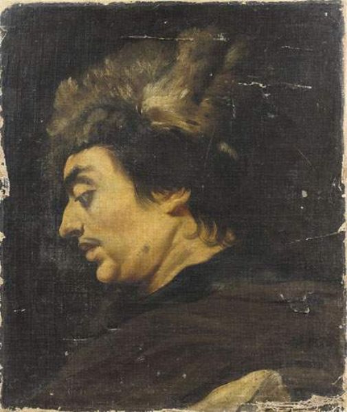 Portrait de profil gauche d'un noble boyard portant une chapka en fourrure.