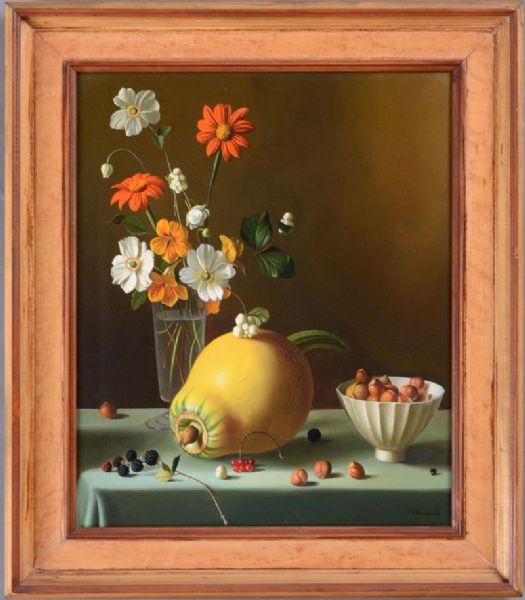STILL LIFE WITH NUTS, BERRIES, MELON AND FLOWERS