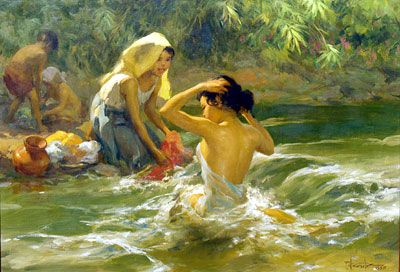 | Flussufer mit badendem weiblichem Akt und junger Frau bei der Wäsche, im Hintergrund spielende Kinder | |