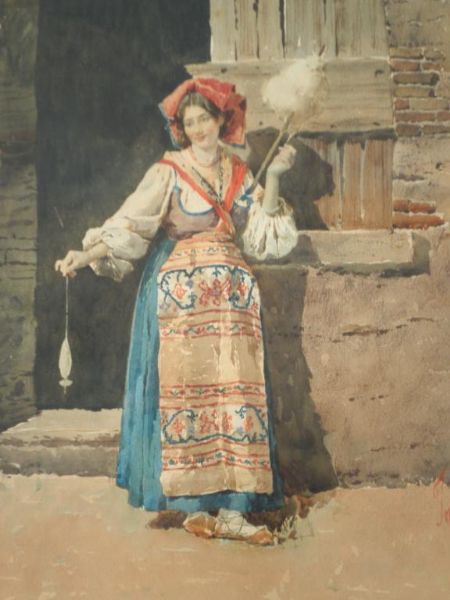 Study of a lady spinning wool