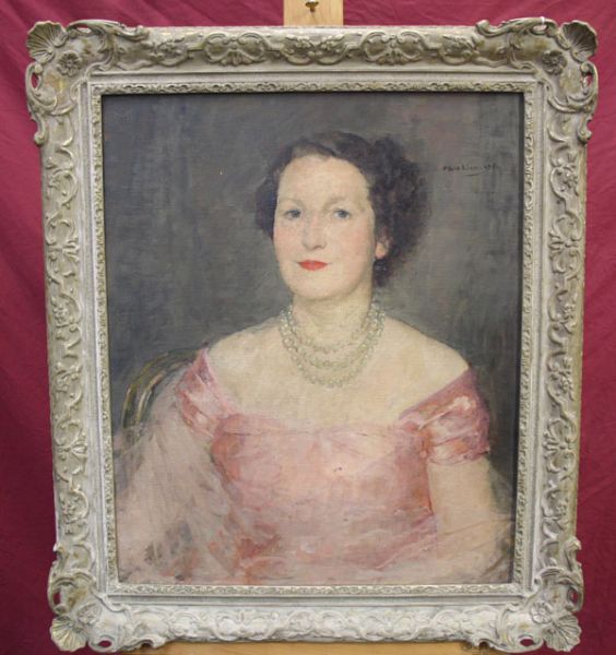 portrait of Mrs W Rennie-O'Mahony wearing evening dress and pearls