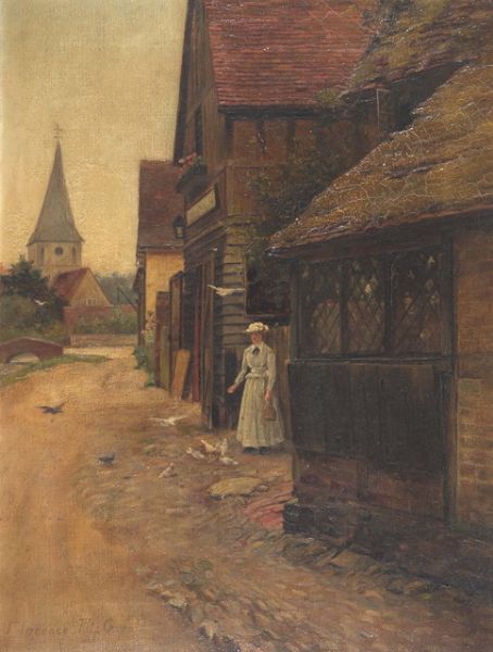 'Shere Village, Surrey - Street Scene with Female Figure, A Church in the Distance'