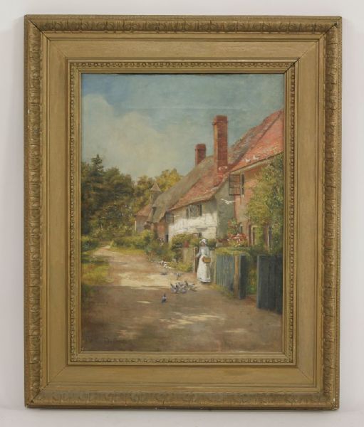 WOMAN FEEDING THE PIGEONS OUTSIDE A COTTAGE