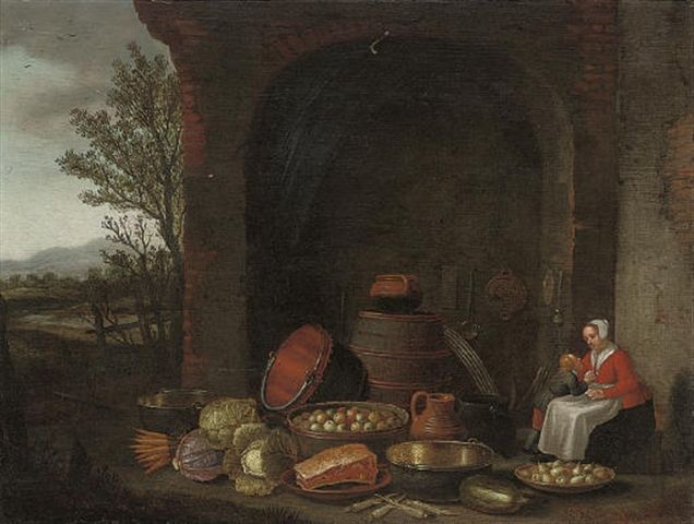 | A maid with a child, preparing food in a courtyard, a landscape beyond | |