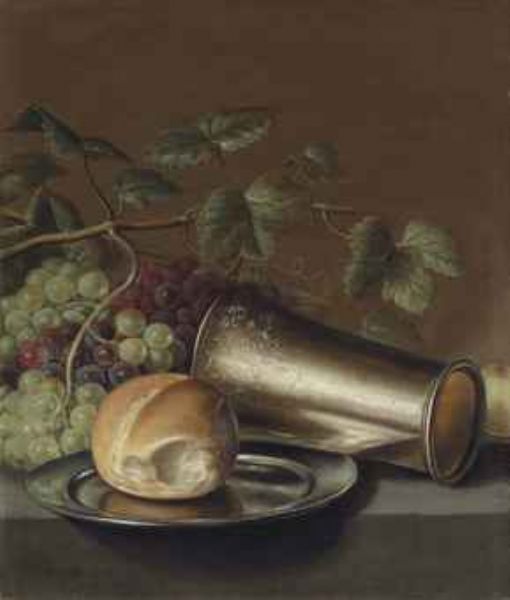 | Bread on a pewter platter, an engraved silver cup, with grapes and a plum on a stone ledge | |