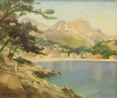 Mediterranean Coastal View with Figures on Beach and Town in Distance