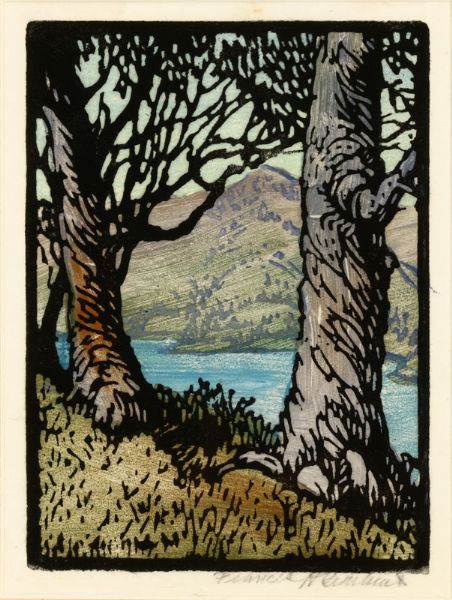 | View of a Hillside and River Through Trees | |