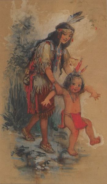Native American playing with child at water's edge.
