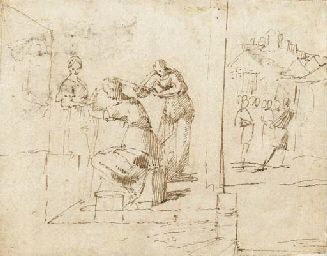 | Une femme assise se faisant couper les cheveux, des figures au fond | |