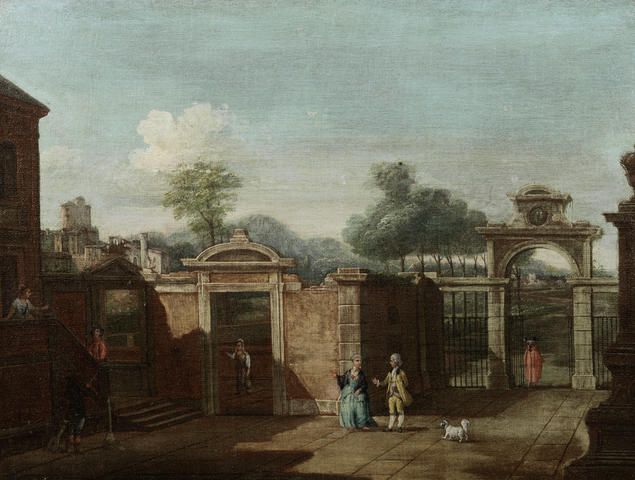 | Elegant figures in a courtyard, an Italianate landscape beyond; and Figures in a capriccio landscape | |
