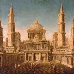 | stylised Islamic building with figures: A scene from an opera seria | |