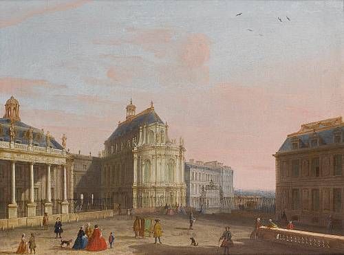 The exterior of the Royal Chapel at Versailles with elegant figures