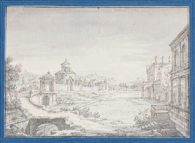 Two landscapes with palaces. Verso with a ground plan. One signed Franc. Battaglioli, one unsigned. Drawing ink and grey wash on paper. Sheet sizes 197×263 mm and 250×348 mm. (2). | |