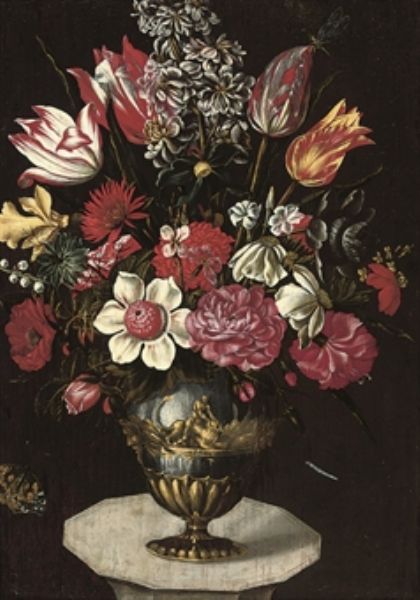 | A stock, chrysanthemums, roses, anemones, parrot tulips, and other flowers in a classical urn on a plinth, with a butterfly and | |