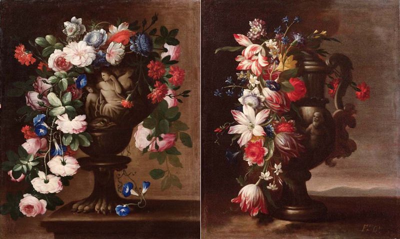 Trionfo di fiori in un vaso di rame sbalzato con divinità marine
