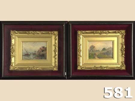 Coppia di opere ad olio su compensato raffiguranti paesaggi