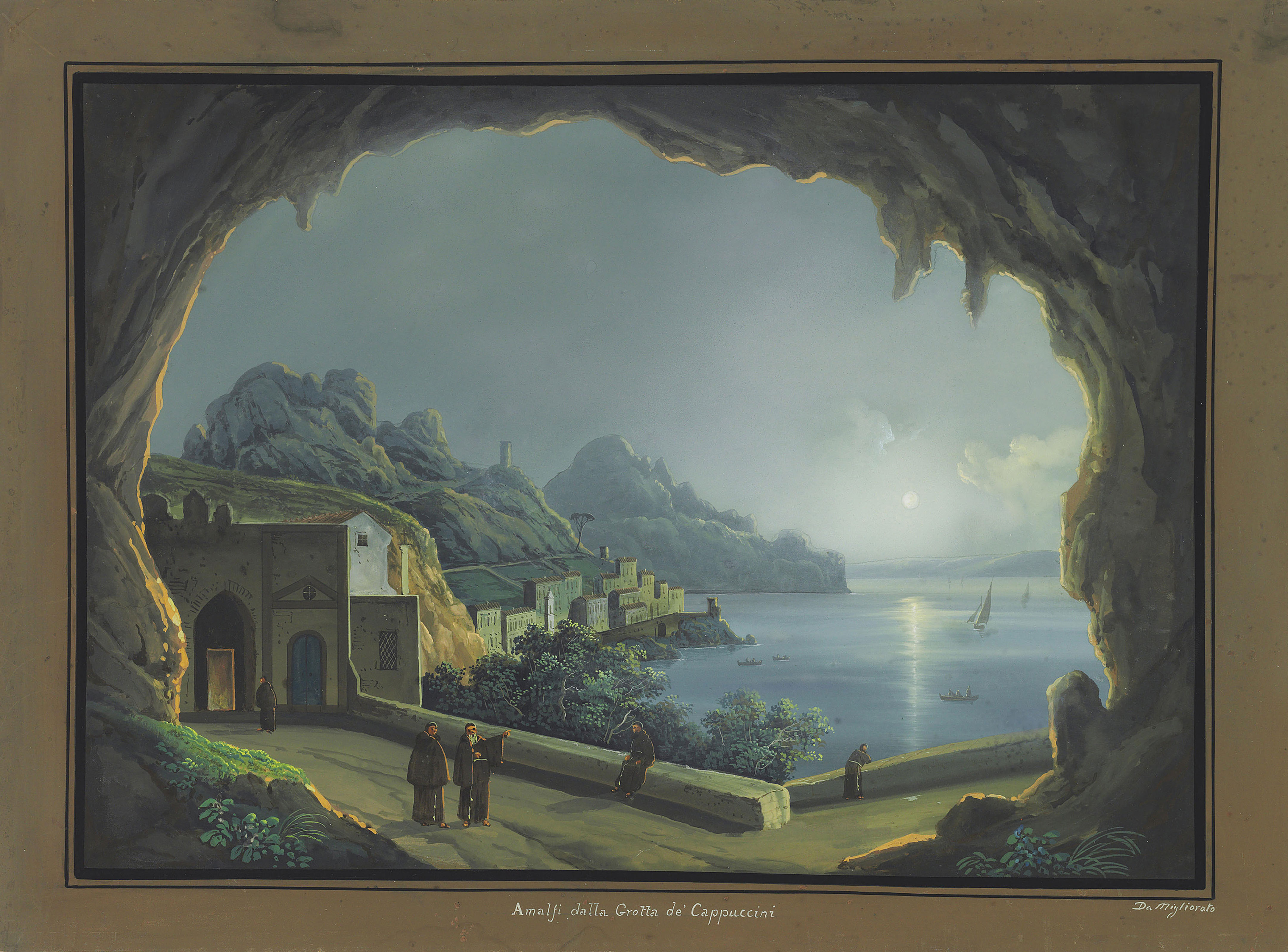 | A view from the Grotta da Cappuccini, Amalfi; and Tourists admiring the bay of Naples | |