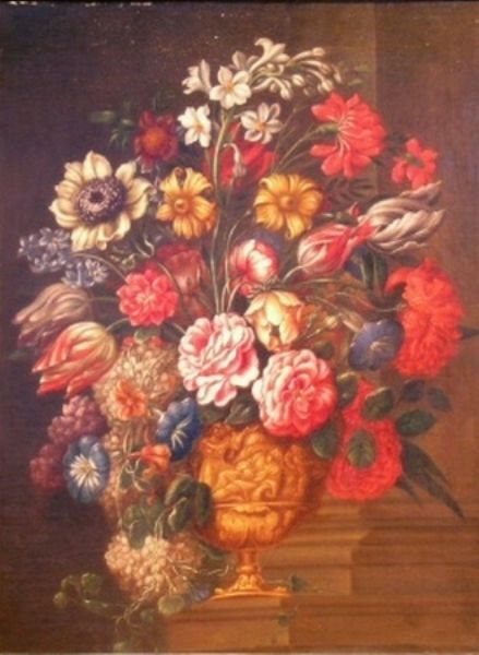 | STILL LIFE OF PEONIES, TULIPS, MARGUERITES AND OTHER SUMMER FLOWERS IN A SCULPTED VASE ON A LEDGE | |