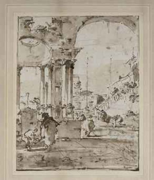 | A Venetian capriccio, a palace with a grand staircase seen through an arch, a ruined domed anteroom on the left | |