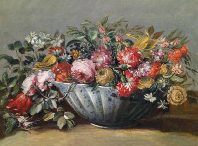| Still life of flowers with roses, lilies, carnations, and other blossoms in a porcelain bowl | |