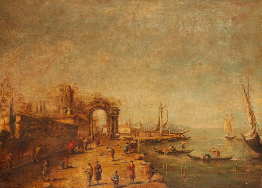 | Architectural caprice at the edge of the lagoon with a tower, | |