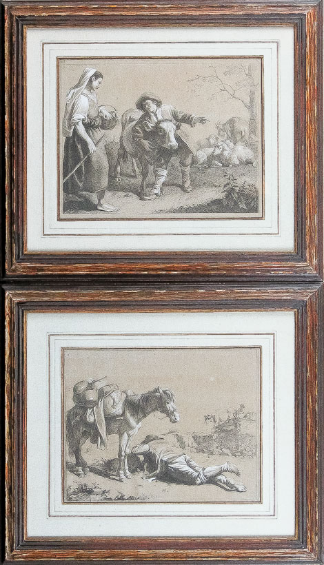 Hirte und Magd mit Kalb, Schafen und Ziege. Schlafender mit Packesel