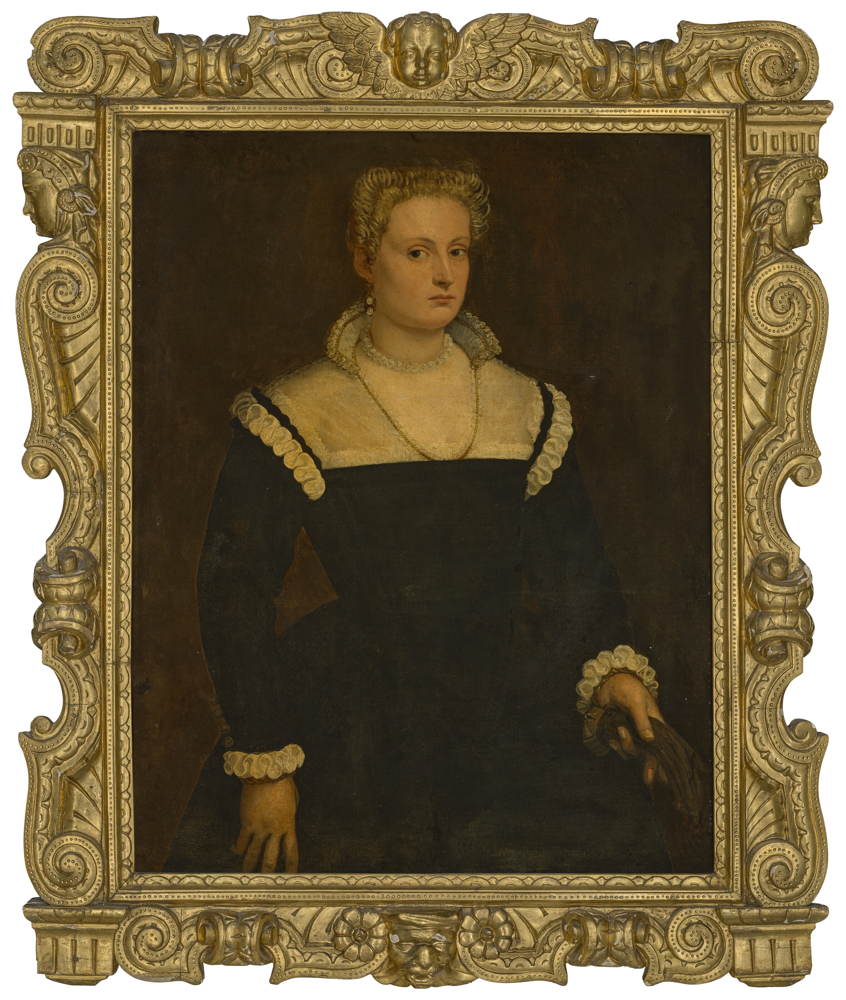 Portrait of a lady traditionally identified as a member of the Morosini family of St Formos three-quarter-length in a black gown and gold-trimmed white partlet holding a pair of gloves