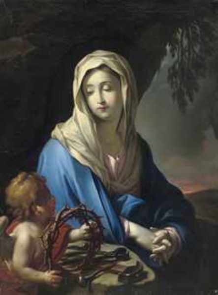 | The Madonna, seated with an angel holding the Crown of Thorns, a landscape beyond | |