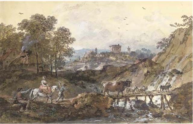 | An Italianate river landscape with travellers and livestock crossing a bridge | |