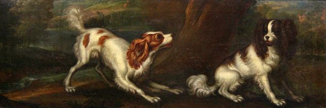PLAYFUL SPANIELS IN A LANDSCAPE