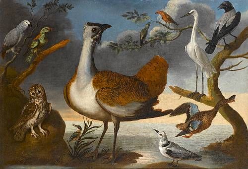 | Study of birds on a bank, a grey parrot, a roller, a tawny owl, a kingfisher, a great bustard, male and female crossbill, a kitt | |
