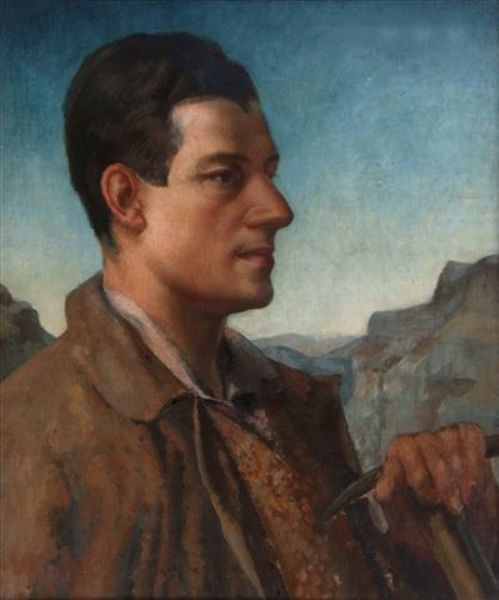 Portrait of Jack St Clair Lindsay in profile, holding a pick axe