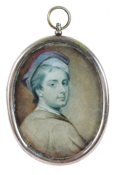| Miniature self -portrait of the artist, he wears a mauve cap as he faces to dexter against a mushroom ground | |