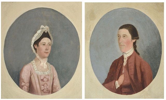 | ortrait of a young lady and her male companion, she wearing a bonnet and pink dress, he wearing a brown jacket and with arm fold | |