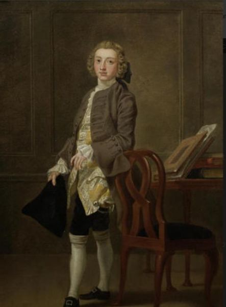 | Portrait of John Barber, full-length, in a brown coat and yellow waistcoat, standing, holding a tricorn hat, in an interior | |
