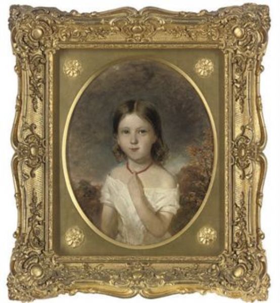 | Portrait of Elizabeth Palfreeman Wilson, age 5, half-length, in a white dress with a red necklace, an extensive landscape beyond | |