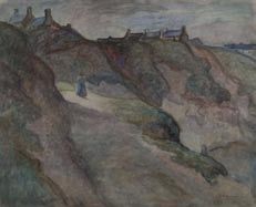Irish Coastal Landscape with Figure and Hilltop Cottages