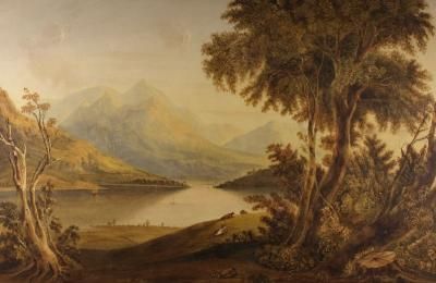 Upland lake scene, cattle in the foreground, view to boats of a lake and mountains