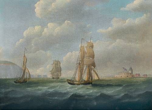 | Shipping passing Hurst Castle heading up the Solent, with the Needles astern of them | |