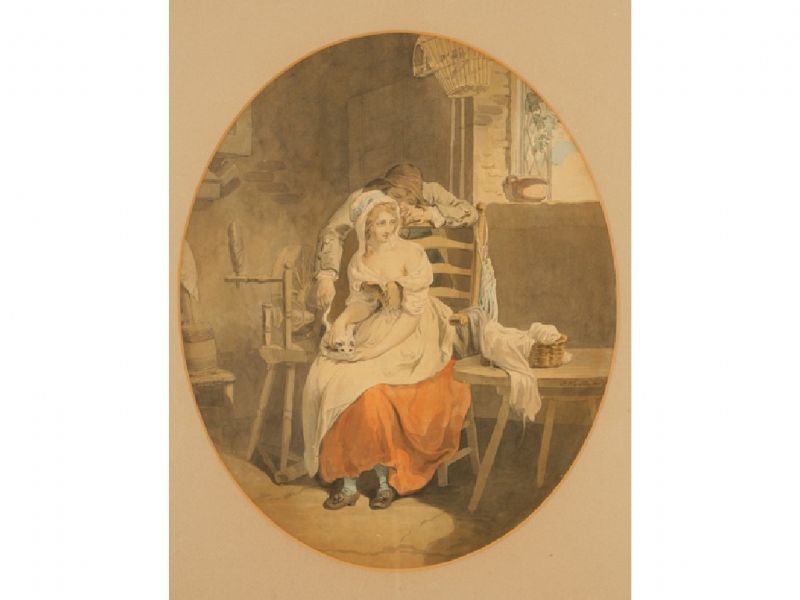 | A woman spinning in an interior, a cat with a saucer of milk on her lap and a man looking on | |
