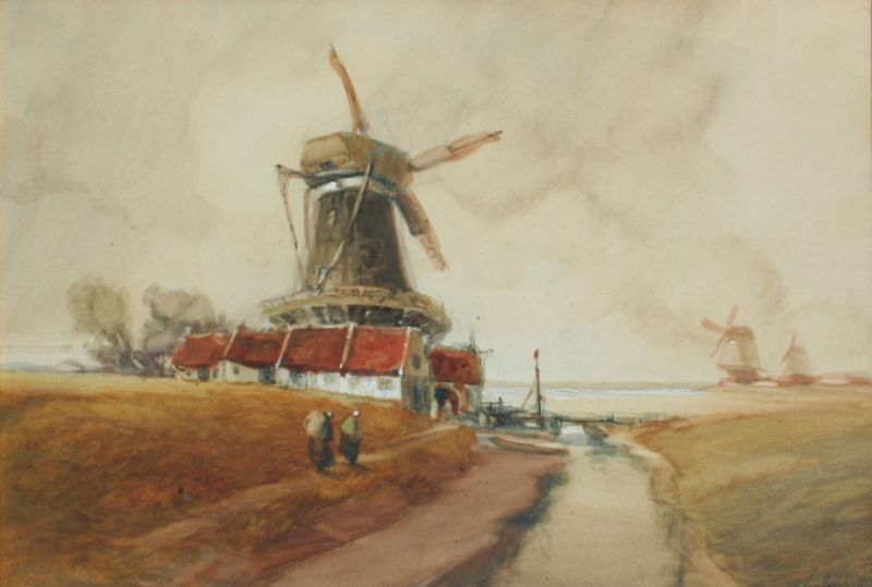 Dutch Landscape with Windmill and Figures Traveling on a Path