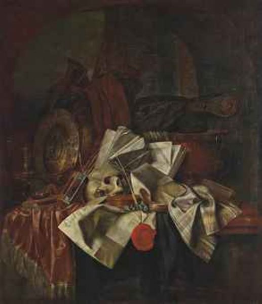 | A skull, an hour glass, a shield with books and papers on a partly draped table | |