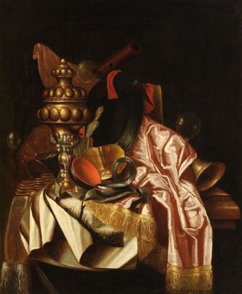 | A Vanitas still life with amongst others a gilt pineapple shaped goblet, musical instruments and a watch | |