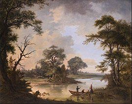 BEWALDETE FLUSSLANDSCHAFT MIT ANGLERN, BAUERN UND KAHN IM VORDERGRUND
