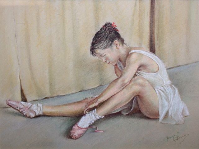 A seated ballet dancer adjusting her shoes