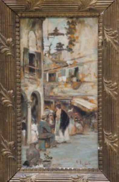 Scorcio di strada con mercato e figure