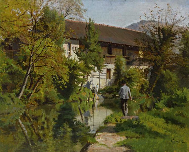 Prachtvolle sommerliche Flusslandschaft mit Architekturansicht und zwei Anglern.